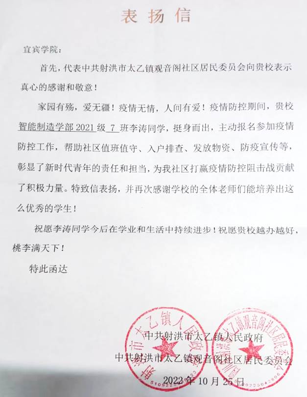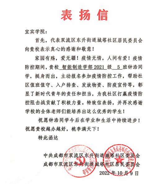 新型冠状病毒肺炎疫情发生以来,智能制造学部21级5班和7班的大学生志愿者钟浩、李涛同学,积极响应当地政府号召,挺身而出,主动报名参加疫情防控工作,帮助社区值班值守、入户排查、发放物资、防疫宣传等,用实际行动弘扬了“奉献、友爱、互助、进步”的志愿服务精神,彰显了新时代青年的责任和担当,为社区打赢疫情防控阻击战贡献了积极力量,受到了当地社区的表扬和称赞。