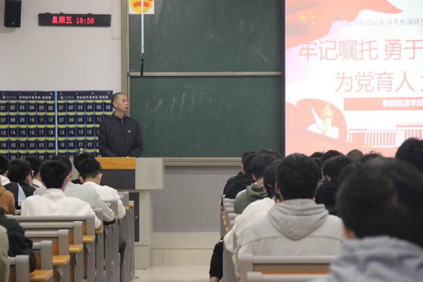 为了让全体学生干部深入学习贯彻落实习近平总书记来川来宜来校考察调研重要指示精神,2022年11月4日晚上19:00,智能制造学部在杏林二栋314教室开展以“牢记嘱托,强国有我”为主题的学生干部培训讲座。本次讲座由智能制造学部党总支书记许泽宏主讲。团总支副书记田蜜,专职辅导员王菲以及智能制造学部全体学生干部参加。