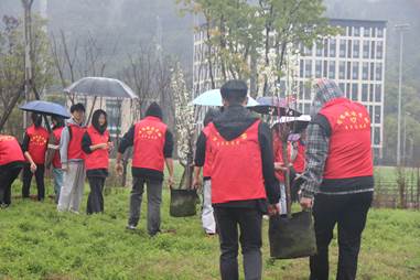在老师们身体力行的带领下,同学们不惧风雨,密切配合,有的同学为忙着的伙伴撑伞,有的同学拿锄头挖坑,有的同学负责运树苗,大家有条不紊的完成着每一个环节,一锄一锄的挖坑培土,一锹一锹的填土埋苗,施肥浇水,道道工序细致认真、有条不紊,气氛热烈,配合默契,师生一道共栽植了桃树、李树共15株。