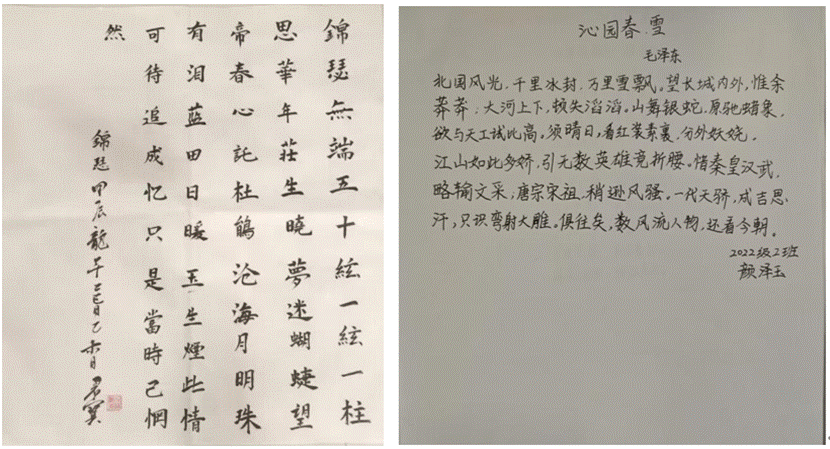 张军保同学和颜泽玉同学通过书法作品展示出他们的艺术才华和深厚的文化底蕴。通过笔尖的舞动,他们将自己的情感、思想和个性融入其中,创作出一幅幅独具特色的作品,这些作品不仅是同学们书法技巧的展示,也是他们对中华民族传统文化尊重和热爱的体现。