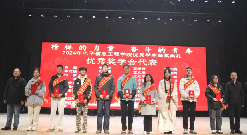 在迎新晚会的舞台上,电子信息工程学院举行了隆重颁奖仪式,由党委书记贺繇和院长文良华为2023-2024学年度国家奖学金获得者、国家励志奖学金获得者、优秀学生奖学金获得者,2024年优秀军训学员、优良学风班、优秀班集体、星级寝室等先进个人和集体颁发荣誉证书。优秀学生代表用自己的实际行动诠释了努力与坚持的价值,充分发挥着榜样的力量,极大地鼓舞了2024级的新生们,激励他们在崭新的大学时光里奋勇向前,努力学习。