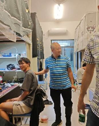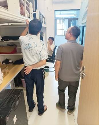 大赛以寝室为单位参赛,通过卫生清洁、创意设计、文化氛围等维度进行综合评比。评分标准涵盖地面整洁度、床铺规范、物品摆放、安全规范等八大要点,同时要求寝室代表向评委讲解设计理念。比赛中,重点聚焦卫生规范、寝室美化与违禁电器排查。评委组逐间走访参赛寝室,严格核查地面清洁、床铺整理、物品摆放等卫生细节,并检查插座线路、电器设备,确保无违规用电现象。各领导与学生亲切交流,强调安全意识和卫生习惯的重要性,对个别存在问题的寝室现场提出整改建议。