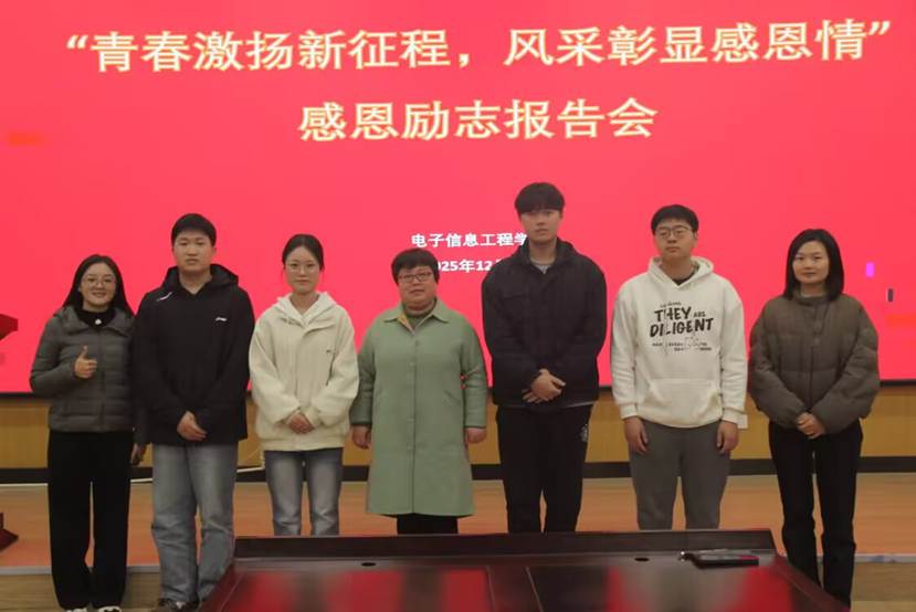 为充分发挥优秀学生的榜样引领作用,鼓励学生懂感恩知奋进,2025年12月1日,电子信息工程学院在临港校区杏林6栋6101报告厅成功举办“青春激扬新征程,风采彰显感恩情”感恩励志报告会。参加本次报告会的有电子信息工程学院党委书记贺繇、党委副书记孟院花、学办副主任侯丽、辅导员王菲、班主任杨嘉佳以及电子工程学院2025级新同学。