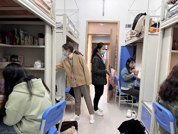 10月12日中午,为了实地了解新生到校入住的具体情况,学工办的老师们走访了新生寝室,了解关心新生住宿情况,仔细查看了寝室的各种设施运行状态,确保设施的安全性。着重强调了宿舍消防安全问题,提醒同学们严禁在宿舍私拉电线,不使用违规电器等。