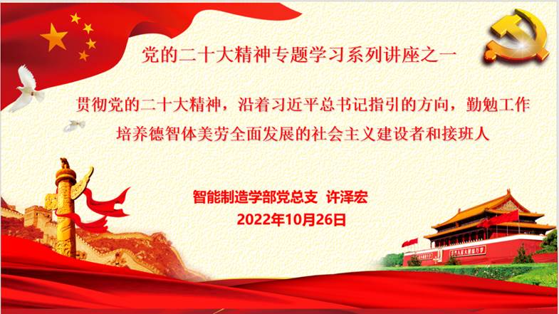 为全面宣传贯彻落实党的二十大精神,智能制造学部党总支将于近期开展系列宣讲活动。2022年10月26日下午,举办了首场宣讲活动。首场宣讲由党总支书记许泽宏同志主讲,学部全体教师参加。