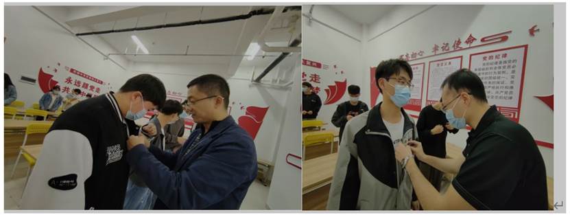 入党宣誓仪式在庄严的《国际歌》中正式开始,何宾、郑力和田蜜为新发展的党员同志佩戴党徽。