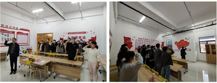 在何宾的带领下,全体党员面向党旗站立,举右手握拳,进行了庄严宣誓。党员们昂首挺胸,在阵阵激昂的宣誓声下,每个党员用心传递着他们昂然向上的斗志和报效祖国的决心。