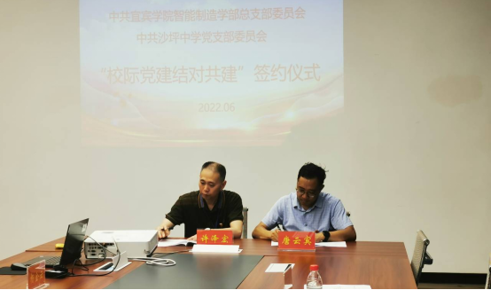 为充分整合校际资源,共同探索新时代、新形势下党建工作新思路、新途径、新举措,打造校际党建结对共建特色品牌,以高质量党建引领学部高质量发展,巩固拓展党史学习教育成果,6月21日下午,智能制造学部党总支与沙坪中学党支部举行“校际党建结对共建”签约仪式,仪式在学部2417会议室举行。沙坪中学党支部书记、校长唐云宾,支委委员、副校长赵鑫华,德育主任邓小舒,团总支书记杨小琴,学部党总支书记许泽宏、正处级组织员杨随军、杨金云,教师党支部书记魏康林等参加签约仪式,仪式由许泽宏主持。