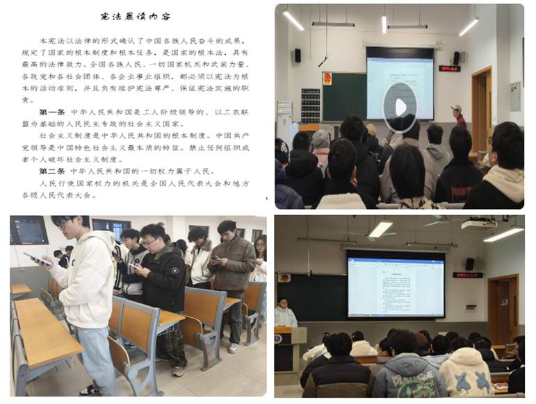 除了观看直播,同学们还利用课前、课间参加了学院线下组织的集中诵读。活动现场庄重肃穆,师生们跟读宪法条款,深刻感受宪法权威和精神。
